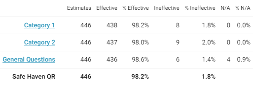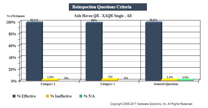 This report displays the percentage of estimates categorised as Effective, Ineffective, or N/A for each category on the Reinspection Form. Only the most current completed reinspection for each estimate is included in the report.