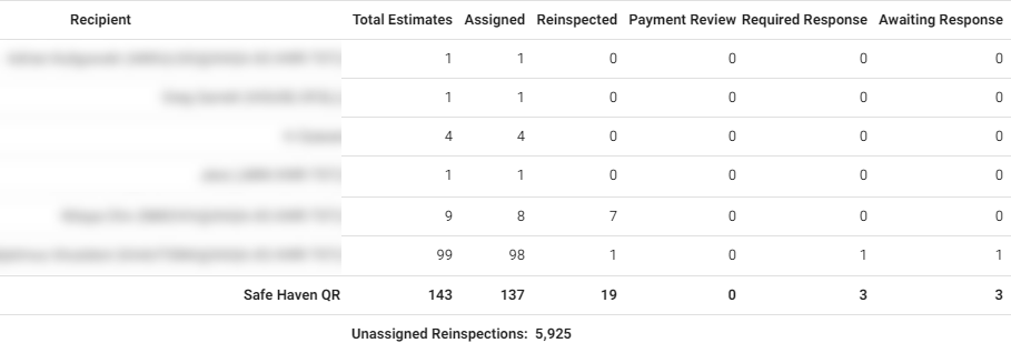 This report displays the reinspection activity for original recipients’ estimates, and calculates reinspection activity totals for a data set. Only the most current completed reinspection for each estimate is included in the report.
