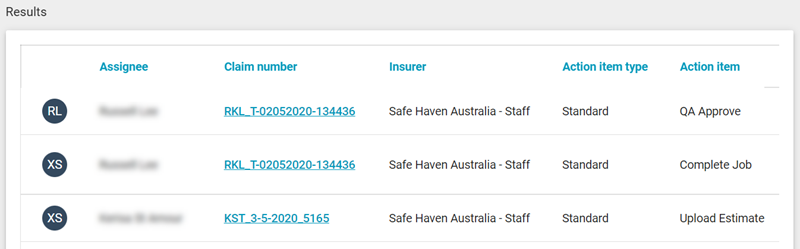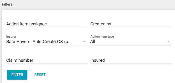 You can filter action items by who created the action item, who it was assigned to, insurer, action item type, claim number, and insured.