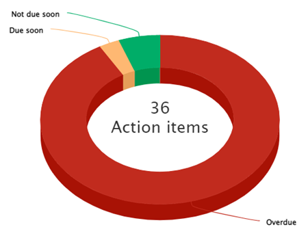 The donut chart on the right illustrates the number of action items that are past due, due in less than two days, and due in more than two days. You can click any of these options to filter the results table accordingly.