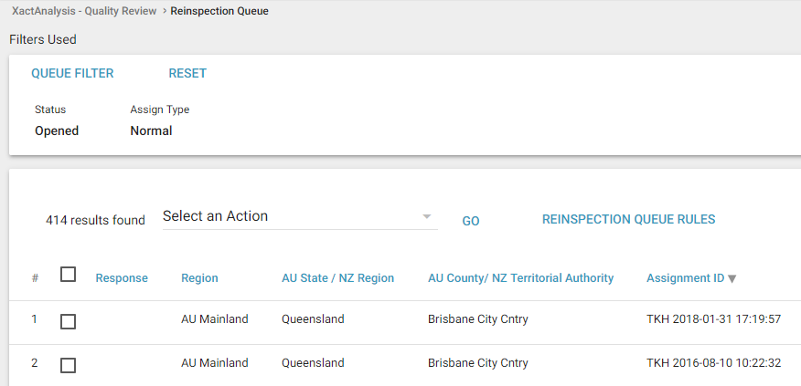 The Reinspection Queue is a module in XactAnalysis® Quality Review (QR) that places all designated assignments into a list for reinspection. The first half of this guide explains how to access and use the general features of the reinspection queue. The last half explains the workflows for two types of users: supervisors/administrators, and reinspectors.