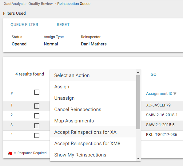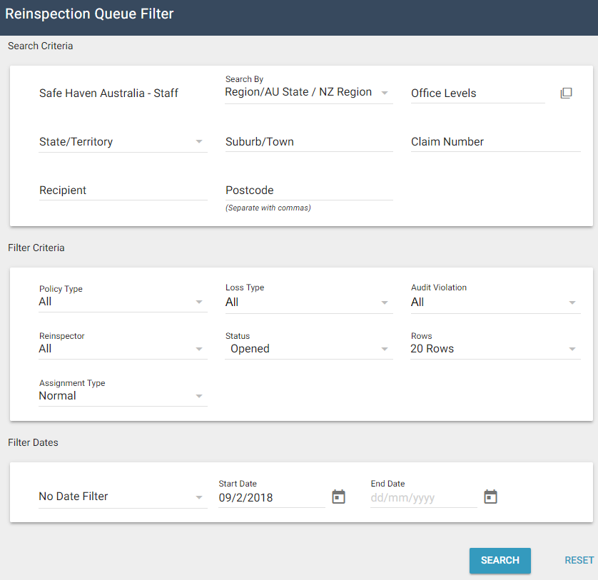 You can filter the queue to view only reinspections from a specific insurer, recipient, or reinspector. You can also filter by assignment status or date. To set the queue back to default view at any time, select reset.