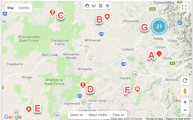 G - Blue circles represent clusters of assignments in an area. The number of assignments is displayed in the circle. Click the circle to zoom in and view the individual assignments and additional clusters.