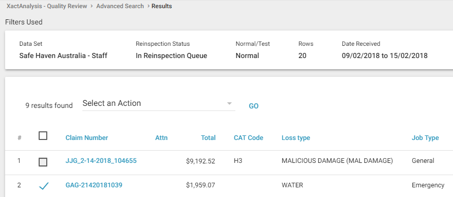XactAnalysis can flag a variety of instances in an estimate to trigger a reinspection. For example, Administrator Jane can set up a complex rule that looks for estimates in the Safe Haven Staff data set with a Flood type of loss and a value between $5,000 and $15,000. Jane could set this rule to automatically assign these estimates to reinspector Dave. When Jane creates the rule, all estimates that fit the rule criteria are automatically sent to the reinspection queue and assigned to Dave.