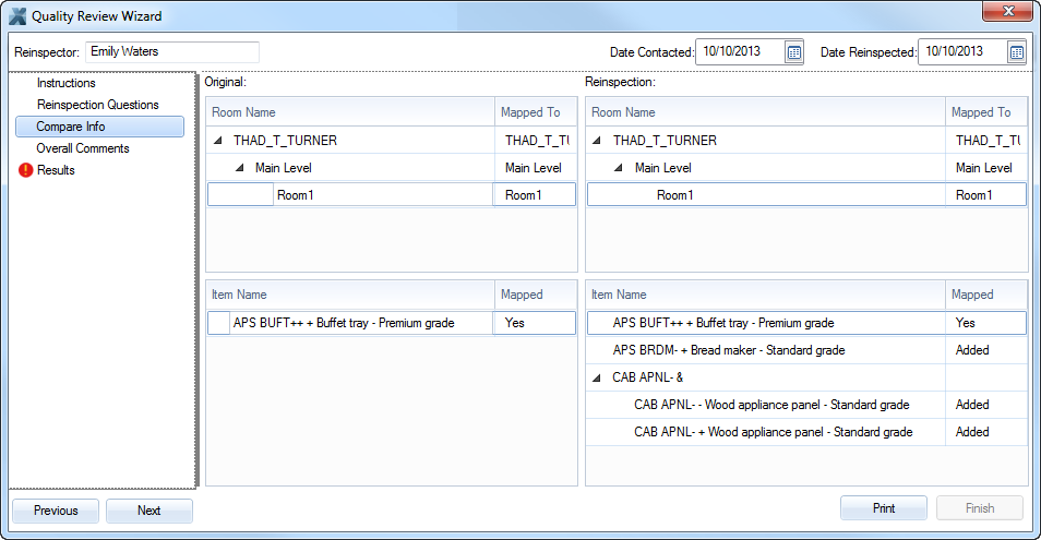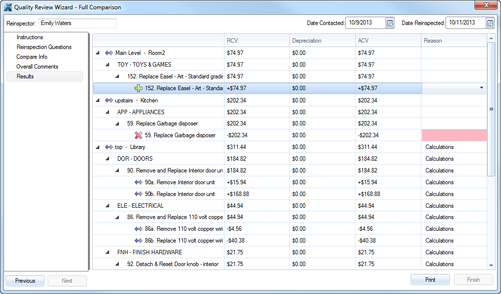 - After answering the reinspection questions, select Next or Compare Info in the navigation tree to compare your room and item changes to the original estimate’s rooms and items. In this case the garbage disposer was removed.