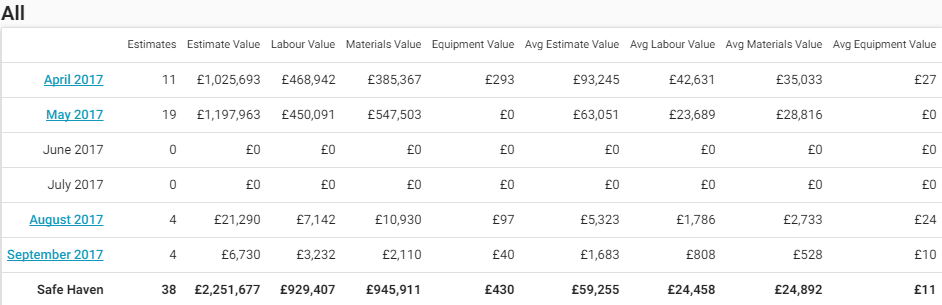 This report displays the average estimate value, labour value, materials value, and equipment value by month for a 6–13 month period. This report can help you track seasonal trends in estimate costs.