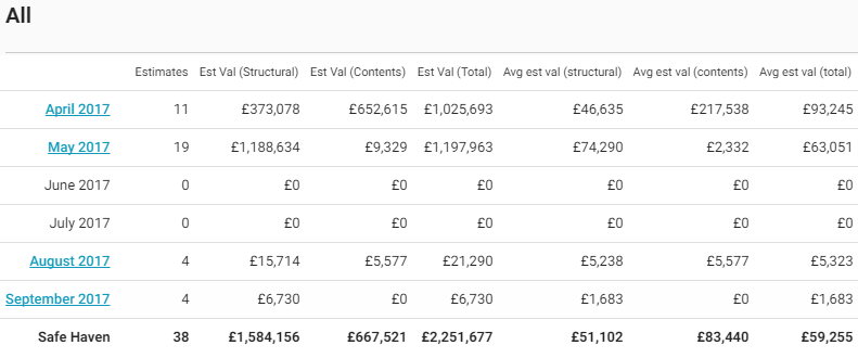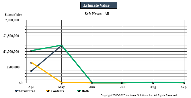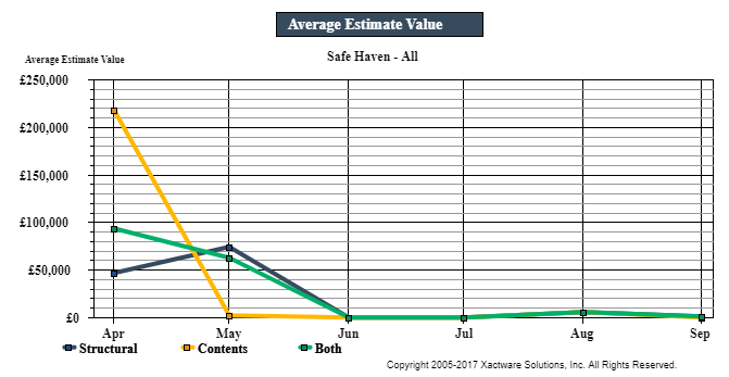 This report presents contents estimate volume, total value, and average value by month for a 6–13 month period. This report helps you track seasonal trends in contents estimate volume and value.