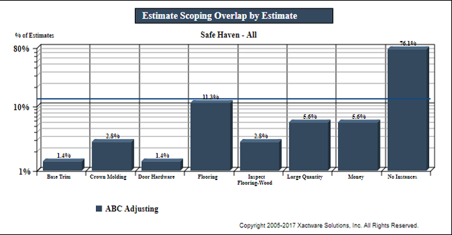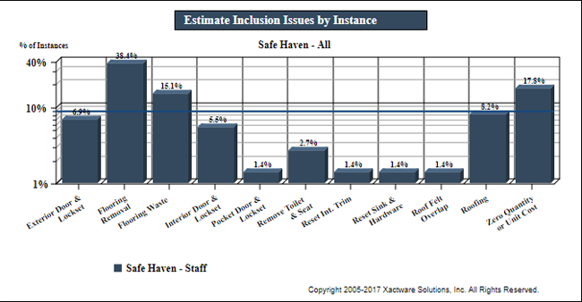 This report displays the percentage and number of instances in which work may have been duplicated on estimates. It does this by detecting combinations of item codes that involve duplication. For instance, a line item (e.g. a new sink) may have been included twice on the estimate, when it was intended to be included once. This report helps you track and address estimate errors, ultimately reducing costs due to waste and error.
