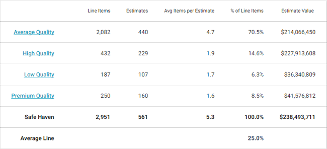 This report displays the percentage and number of estimate items (line items) separated into the four Xactimate category grades (low, average, high, and premium). This helps you see the item quality in a given set of estimates.