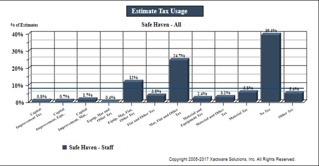 This report displays the number and percentage of estimates with tax, material sales tax, equipment tax, labour tax, flat tax, other tax, and any combination of these taxes.