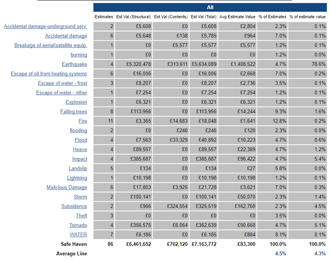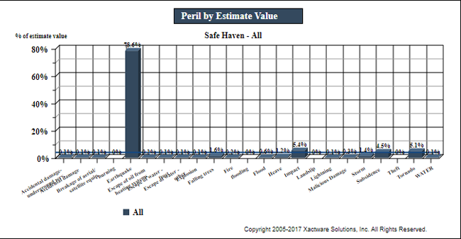This report displays the percentage, value, and number of estimates by peril. This report helps you track which peril are most frequent and infrequent, which often varies by locality.
