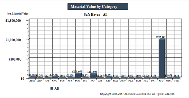 This report displays the 20 price list categories that contain the highest value of materials for a given data set or hierarchy. The Other total includes all categories that are not part of the 19 categories appearing in the report. Lower hierarchy levels may have material values that vary from these categories, so fewer categories may be displayed. This report helps you see which materials are most and least used.