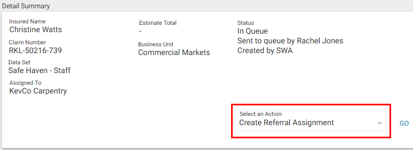 - On the original (parent) Assignment Detail page, select Create Referral Assignment from the Select an Action menu.