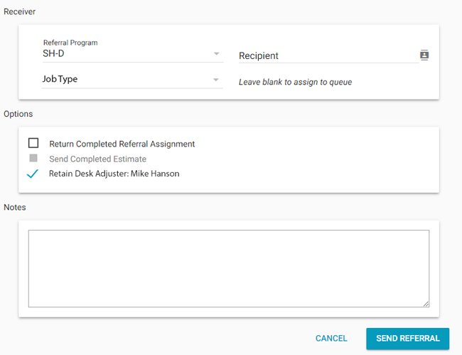 - In the Notes/Instructions for Referral Assignment area, enter notes for the adjuster/contractor. Click Append Estimate Notes to include the notes that were sent from XactAnalysis with the original assignment.