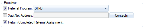 - The Referral Assignment dialogue box appears. To assign the referral to a data set, select the Referral Program check box in the Receiver area, and choose a data set from the menu. Administrators with rights to that data set can view the referral assignment in the Assignment Queue and assign it to an adjuster/contractor.