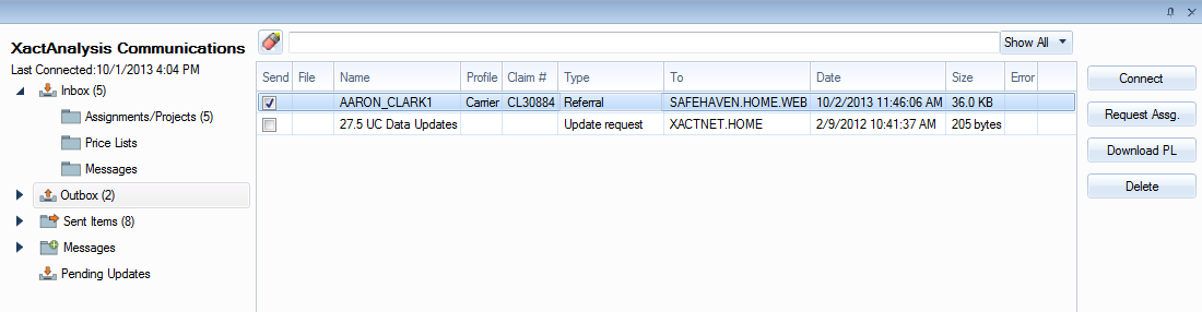 - Go to the Outbox in the XactAnalysis Communications pane. Select the check box in the Send column for the assignment.