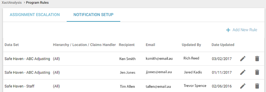 The Program Rules module allows you to set up notifications to inform you of issues with service providers and internal programs. In the Assignment Escalation tab, you set up notifications for assignment escalation issues, and in Notification Setup, you determine exactly who should be notified regarding these issues. You can set up multiple employees to be notified for any location, and you can set up any employee to receive notifications for multiple locations.