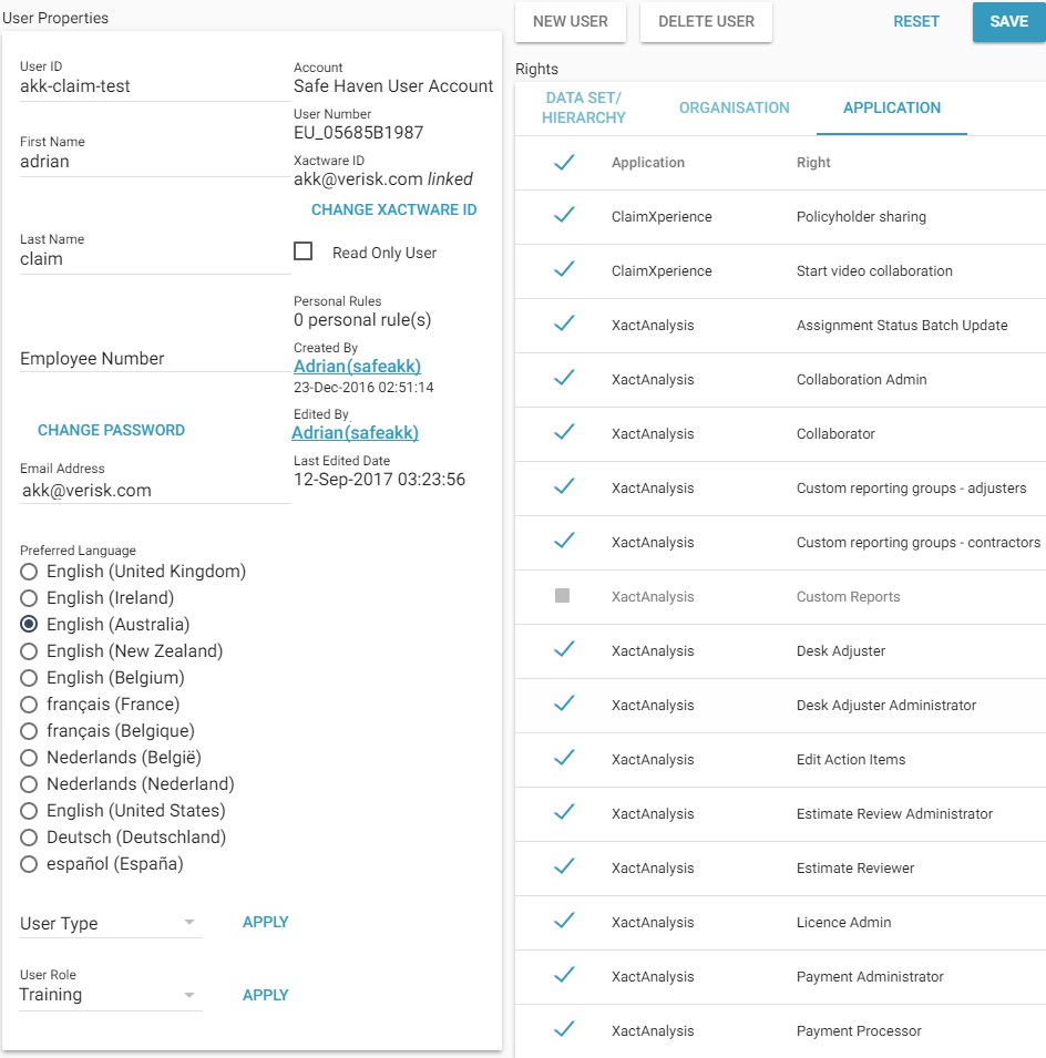 The Xactware ID must be an email address (preferably the user's primary email address) and must be unique across all XactAnalysis users. If you enter an Xactware ID that matches the new user's existing Xactware ID, when you click Save the user receives an email instructing them to link their Xactware ID to the new account. The email includes a link to the XactAnalysis login page. For more information about linking users, see Xactware ID.