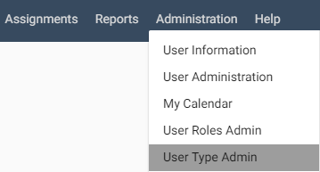 - Select User Type Admin from the Administration menu.You must have the User Admin application right to access User Type Admin. See Add Users for information about adding rights.