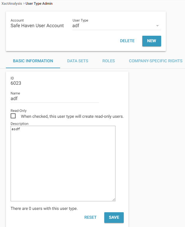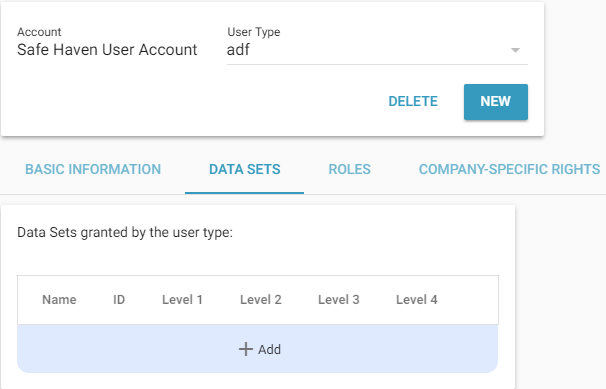 - Click Save. The user type appears in the User Type drop-down menu. The user type still needs to be connected to data sets, user roles, and company-specific rights. The following steps describe this process.