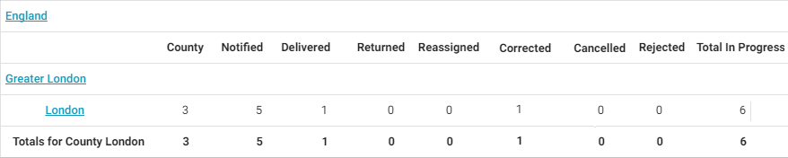 This report displays the statuses assignments receive during the report’s date range by region / office level. It further separates the assignment totals for some of the statuses by those with duplicate claim references and those without duplicate claim references. This report helps you track assignment activity volume by geographic/organisational area.
