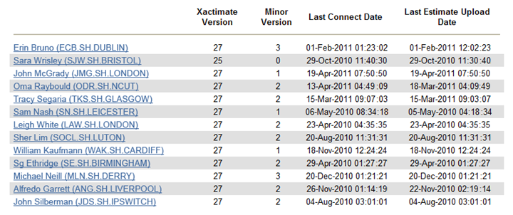 This report displays information about the Xactimate setup for each user, including version, minor version, last connect date, and last estimate upload date. This report allows you to verify that Xactimate users have the proper version of the software.