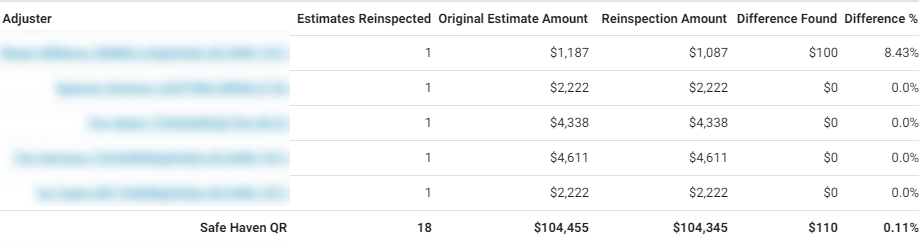 This report compares onsite reinspections with desk reinspections, helping you see the effectiveness of each. Only the most current completed reinspection for each estimate is included in the report.