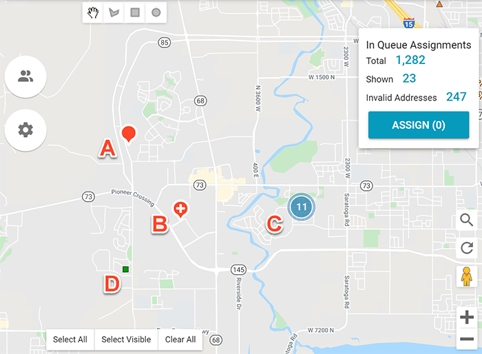 To select individual assignments, simply click their markers. The map also provides time-saving tools that allow you to select multiple assignments at once.