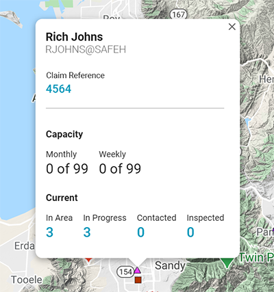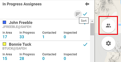 - Each assignee card lists the number of assignments the assignee has that are in the area, that are in progress, that are marked as contacted, and that are marked as inspected. You can click any of these numbers to view the assignments in Search.
