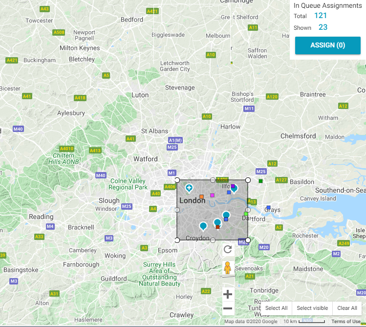 The Assignment Queue map uses Google Maps to display the location of every assignment that is currently in progress (coloured shapes) or unassigned (red location markers).