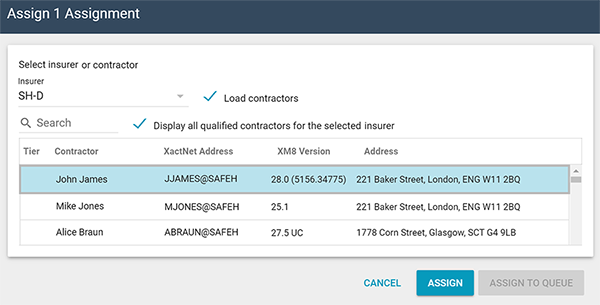 The Assign dialogue box allows you to assign the assignments to an adjuster/contractor or to a different insurer.