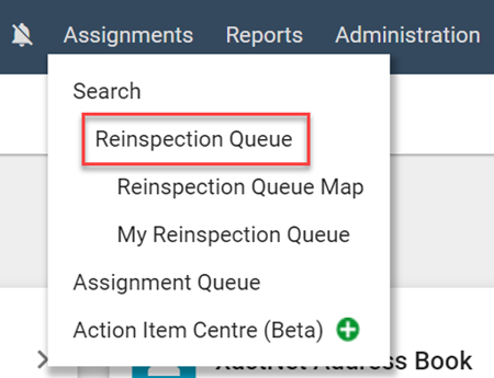 - Select Reinspection Queue from the Assignments menu. To see only reinspections assigned to you, select My Reinspection Queue.