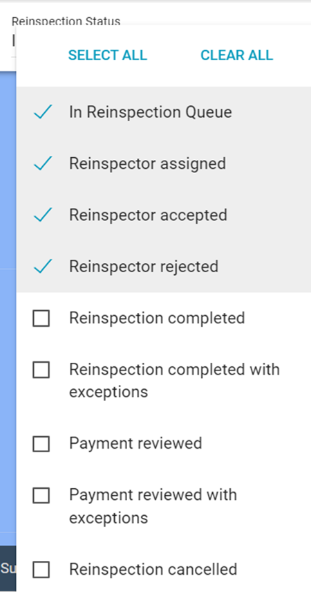 - Use the Reinspection Status filter in Search to find assignments with specific reinspection statuses.