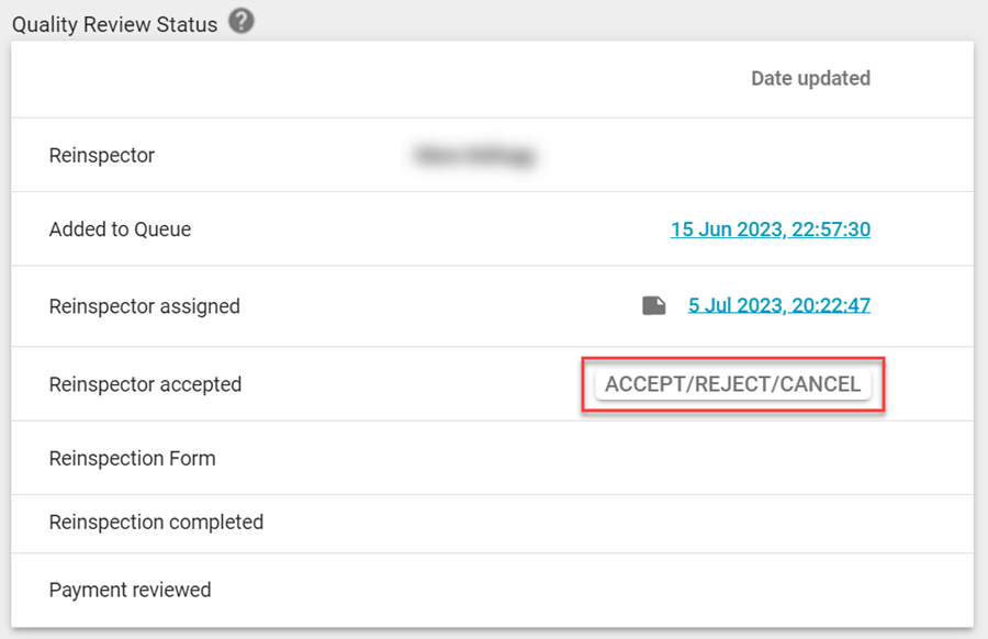 - In the Quality Review Status section of the Details tab, go to the Reinspector Accepted line and select Accept/Reject/Cancel.
