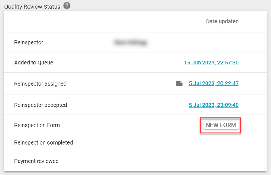 After you have accepted the reinspection, the Reinspector Accepted status is updated, and a link to a new reinspection form appears in the Reinspection Status section of the Details tab.