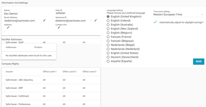 In User Information, you can view the following information about your XactAnalysis® Quality Review (QR) account: name, user ID, Xactware ID, profile picture, email address, user rights, XactNet addresses, and language settings. You can manage your Xactware ID information, profile picture, email address, password, and default language settings. To update your name, user ID, user rights, and add XactNet Addresses go to User Administration.