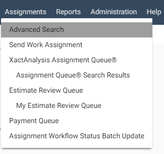 Assignments are sometimes reassigned to a different adjuster or data set. Use this menu to search for assignments that have or have not been reassigned.