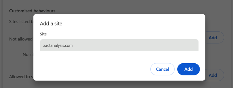 - Under Customised behaviors, select the Add button next to Allowed to send pop-ups and use redirects.