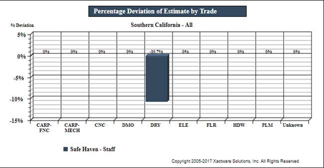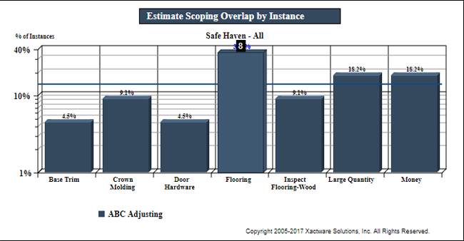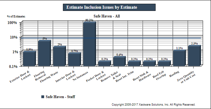 This report displays the percentage and number of instances in which work may have been duplicated on estimates. It does this by detecting combinations of item codes that involve duplication. For instance, a line item (e.g. a new sink) may have been included twice on the estimate, when it was intended to be included once. This report helps you track and address estimate errors, ultimately reducing costs due to waste and error.