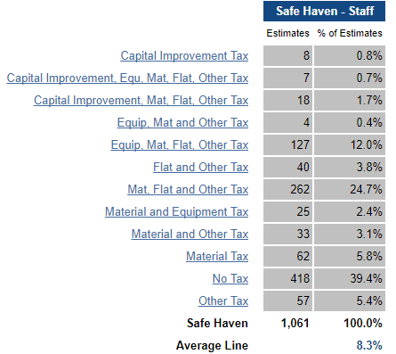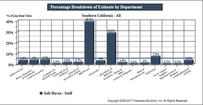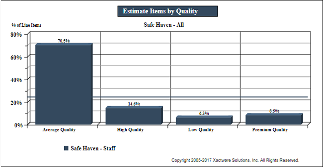 This report displays the percentage and number of estimate items (line items) separated into the four Xactimate category grades (low, average, high, and premium). This helps you see the item quality in a given set of estimates.