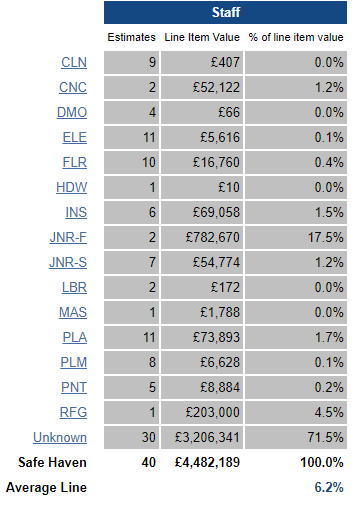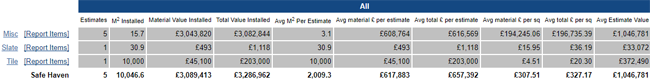 This report displays the percentage and value the line items from each trade (Carpenter, Plumber, etc.) contribute to the total estimate pound value, helping you track the trades used most frequently.