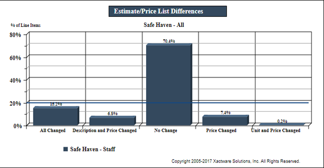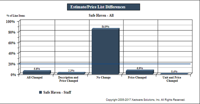 This report displays the percentage and number of price list line items that changed in Xactimate during the estimating process, thereby deviating from the checkpoint pricelist. It shows changes in unit of measure, description, price, and all combinations of these categories. All Changed includes line items that are not in the price list.