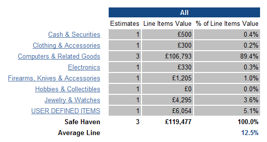 Cause of loss categories: Collapse, Fire, Frozen Pipe, Hail, Water Heater, etc (Select the Components link to see individual items used to categorise the estimates)