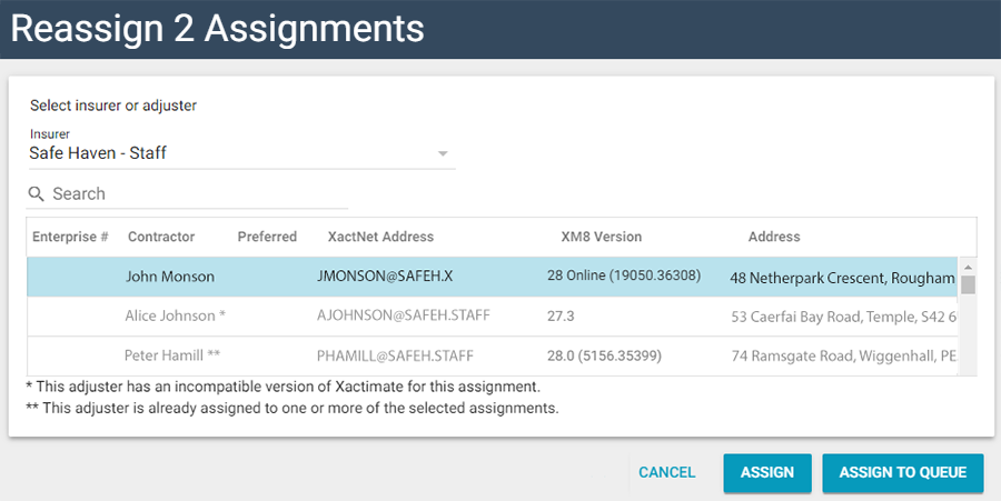 Reassign selected assignments to a different adjuster/contractor or data set from Advanced Search Results. You may select only assignments that have already been assigned. Assignments with the status of In Queue may not be reassigned. You cannot select multiple assignments to be reassigned from Advanced Search Results if they are not from the same client group. This option is not available for read-only users.