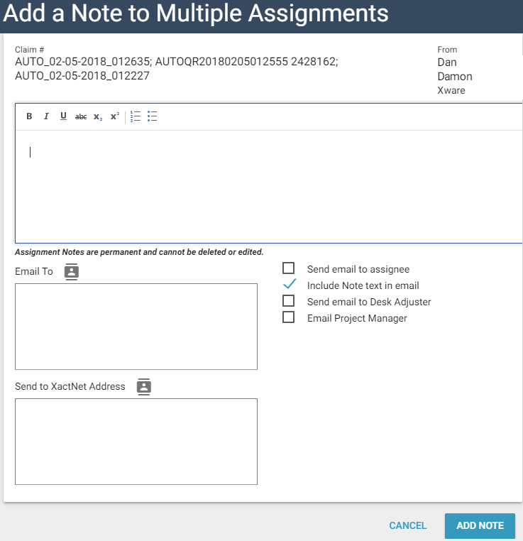 - Select the check boxes of the assignments to which you want to add a note.