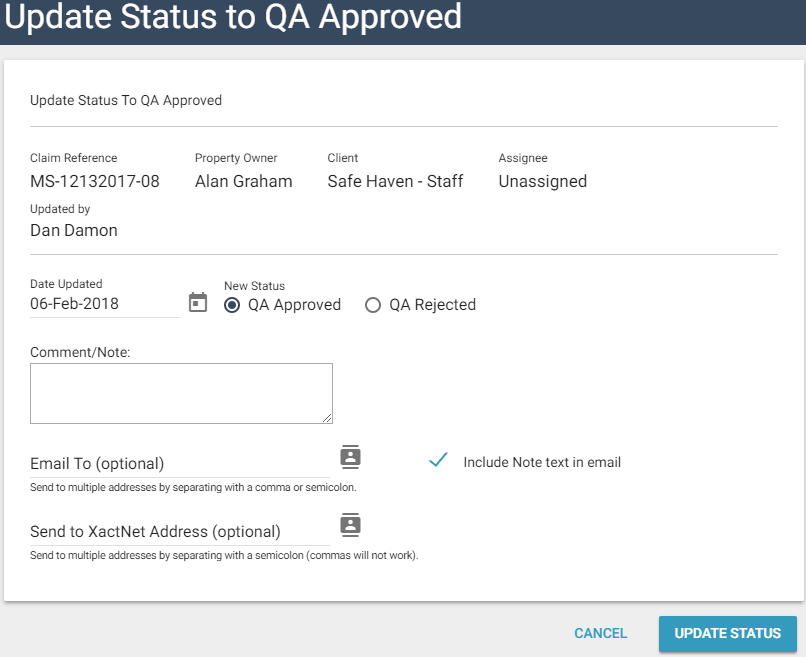 - Click Go. The Update Status to QA Approved dialogue box appears.
