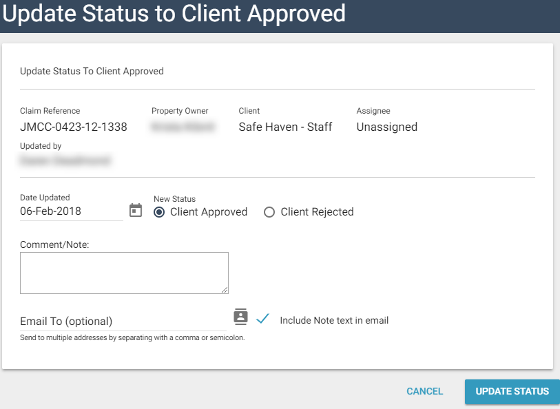 - Click Go. The Update Status to Client Approved dialogue box appears.
