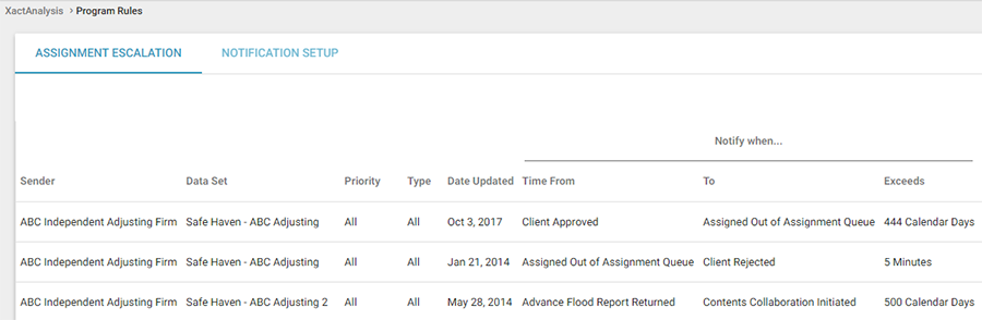 Assignment Escalation helps you handle assignments that are not promptly taken care of by the selected service provider. If this situation occurs, you can set up XactAnalysis to notify you, rotate the assignment to the next service provider, or both. Assignment Escalation simply allows XactAnalysis to escalate an assignment to the next service provider or back to you.