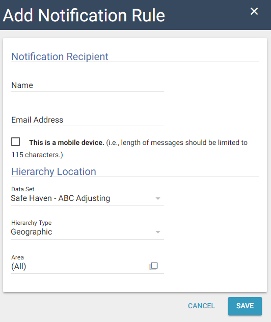 - Area: Appears when the Geographic hierarchy type is selected. Click the SmartList button to select an area for the recipient to receive notifications for. The recipient will be notified of escalated assignment issues in the areas you select.