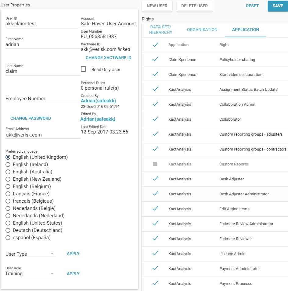 - In the User Type section, select the appropriate user type (if applicable), and click Apply.When you apply a user type, you automatically assign the user all data set and hierarchy rights, all company-specific rights, and all user roles associated with that particular user type. You will not remove any previously existing rights. Any updates made to the user type will update the rights and roles granted the user. See User Type Admin for information about creating and applying user types.